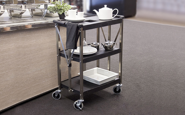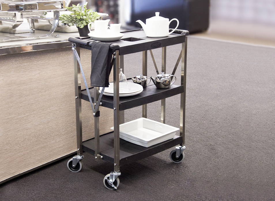 堅(jiān)厚的不銹鋼材料,車表面帶有磨砂處理,美觀耐用卡扣設(shè)計(jì),可快速、簡(jiǎn)單的折疊或展開(kāi)餐車; 折疊存放可減少50%的面積; 符合人體工學(xué)的把手設(shè)計(jì),操作舒適; 4”萬(wàn)向靜音輪,其中兩個(gè)帶剎;安全,安靜可承重150KG; 廣泛使用于各類餐廳和酒店.
